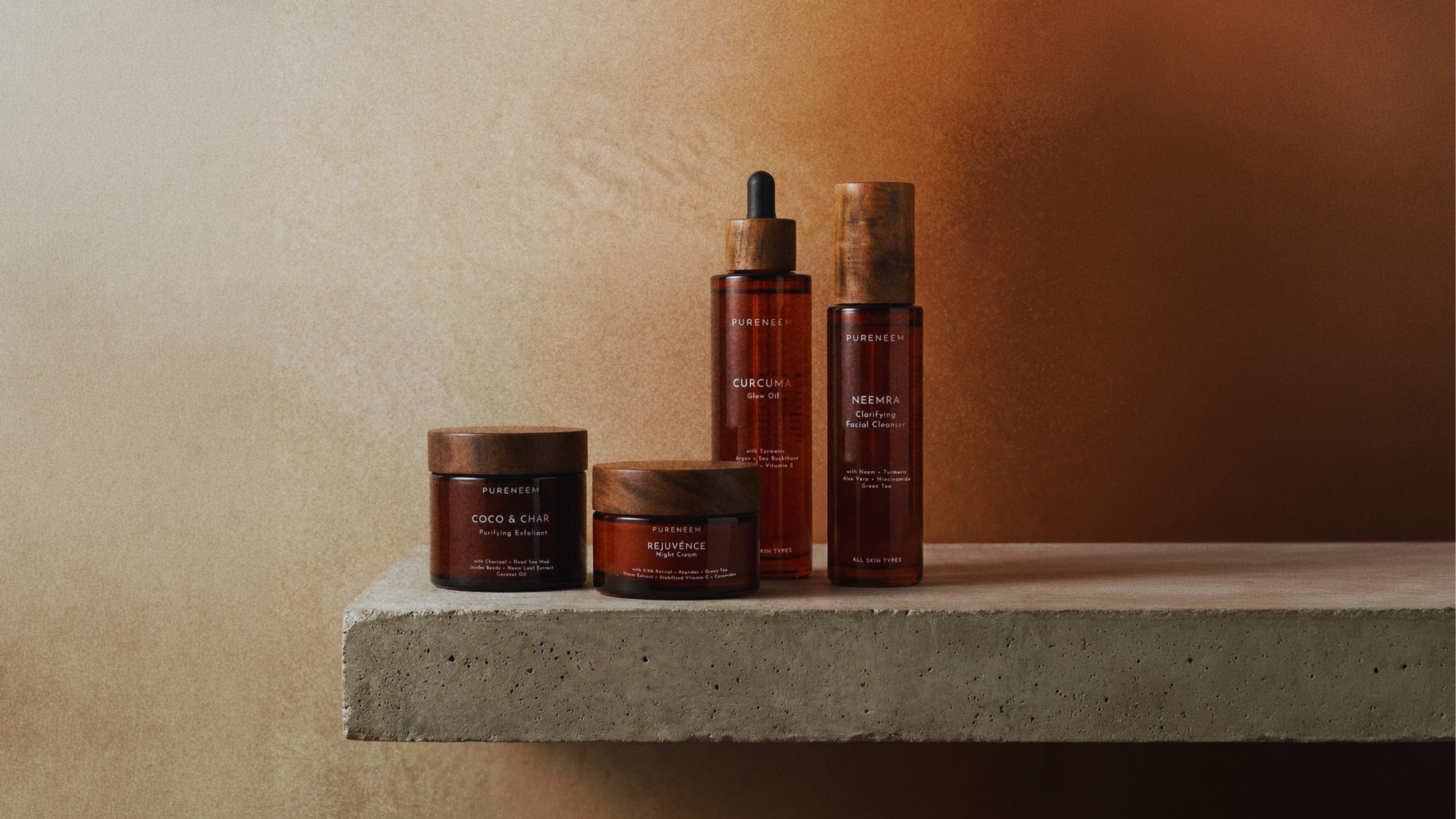 Neem, turmeric, licorice, centella, rosehip, argan, manjishtha. Ayurvedic depth, named openly.